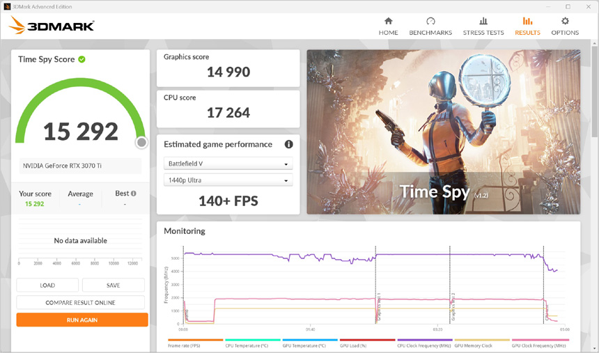 포르자 호라이즌 5 벤치마크를 실행한 모습으로 최고 옵션으로 설정했을 때 QHD 해상도에서도 100FPS 이상으로 플레이 되는 것을 확인할 수 있었다. RTX 3070 Ti 정도의 그래픽카드를 사용한다면 옵션걱정 없이 플레이 할 수 있다.