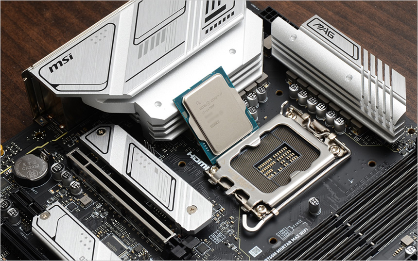 테스트에 사용된 MSI MAG B760M 박격포 맥스 WIFI는 14세대 인텔코어 프로세서를 완벽 지원한다. 특히 바이오스 업데이트가 필수적인 구형 모델들과 달리 최근에 출시되는 제품의 경우 14세대 인텔코어 프로세서를 사용할 수 있도록 바이오스가 업데이트 된 상태에서 출시되어 불편없이 사용할 수 있다. (사진과 같이 박스에 스티커가 부착되어 있다.)