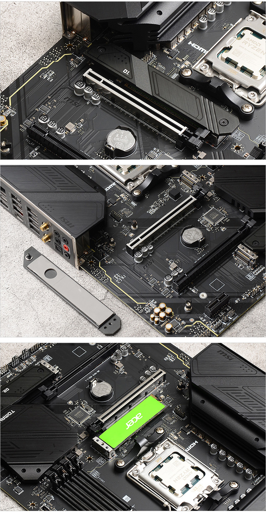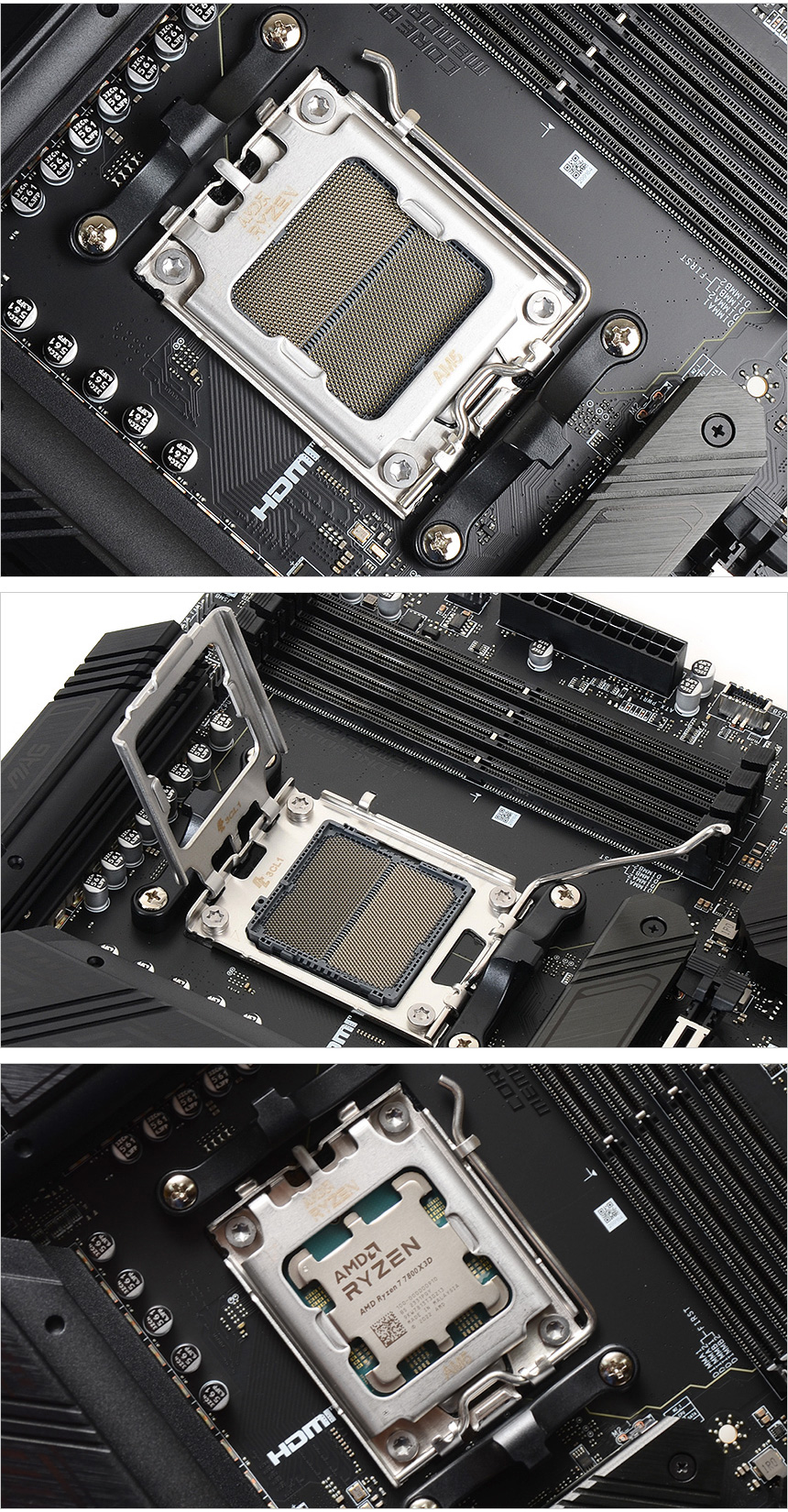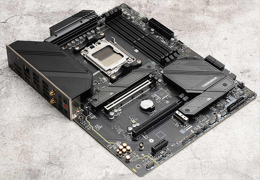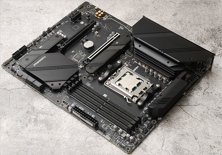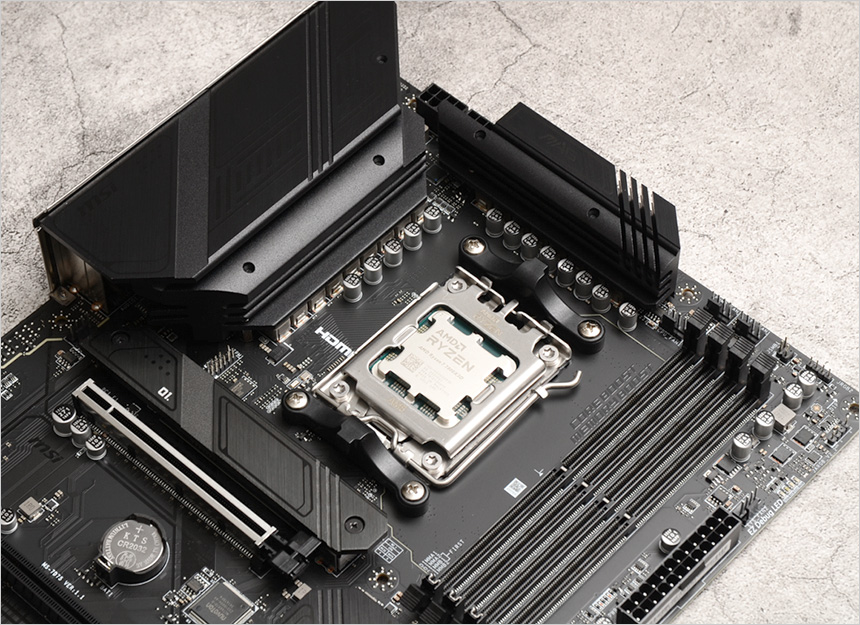 소켓의 모습으로 AM4를 지원했던 구형 메인보드들과 달리 AMD 프로세서 7000 시리즈 장착이 가능한 AM5 소켓이 설치된 것을 확인할 수 있다. (CPU에 핀이 있는 방식에서 메인보드에 핀이 설치된 방식으로 변경된 것이 가장 큰 특징이라 할 수 있다. 더 이상 일명 '무뽑기' 등의 불편없이 사용할 수 있게 되었다.) 참고로 기본적인 홀 규격이 AM4 와 동일해 몇몇 구형 쿨러는 그대로 사용할 수 있다. (쿨러 장착을 위한 2개의 걸쇠가 설치된 것도 확인할 수 있다.)