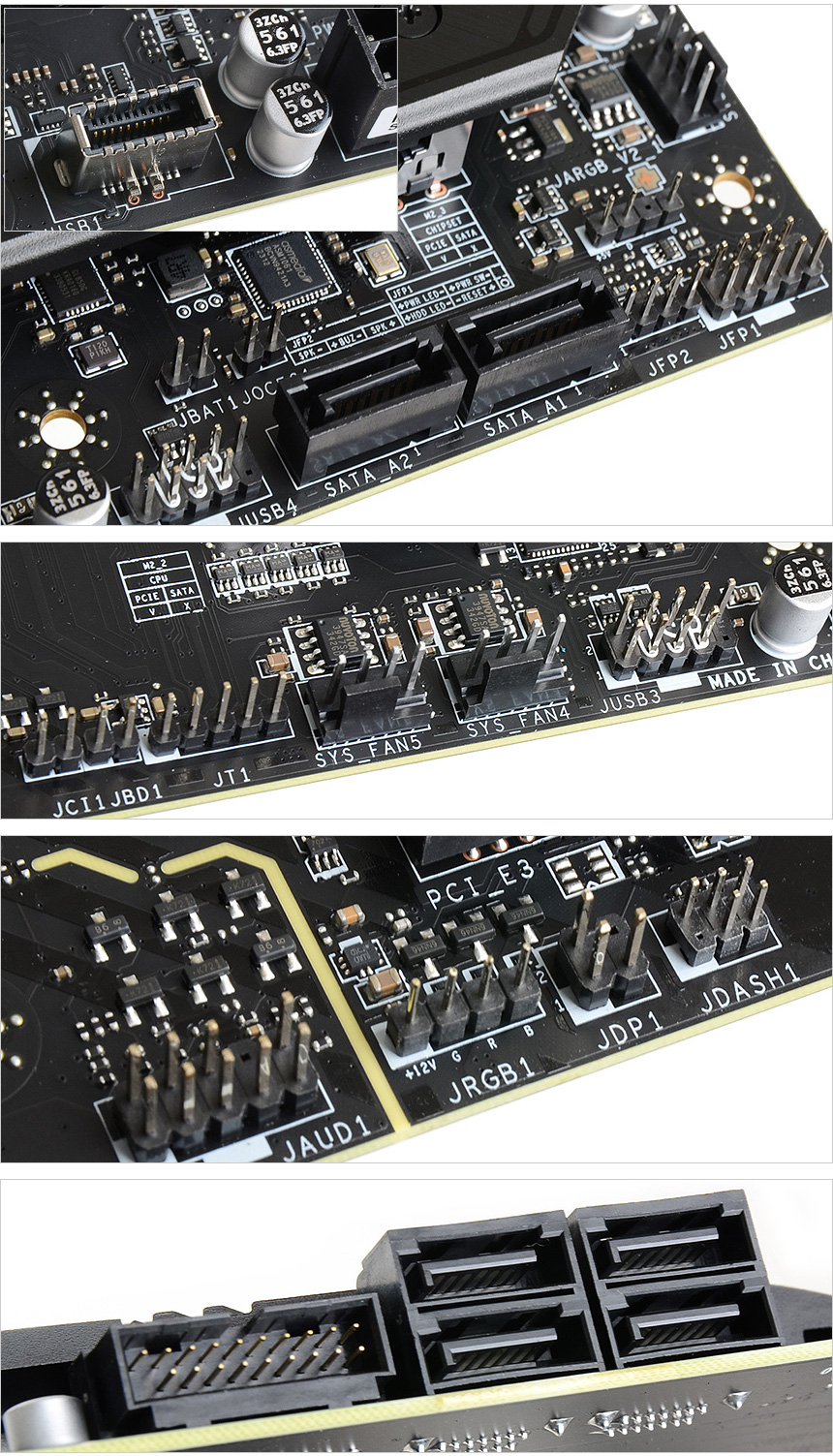 내부에는 USB 3.2 Gen2 (C타입) 을 위한 커넥터와 USB 3.2 Gen2, 2개의 USB 2.0 커넥터를 제공해 PC케이스의 USB 단자에서 빠른 속도를 즐길 수 있으며 총 6개의 시스템 팬 단자를 지원해 다량의 팬을 연결해 시스템의 열을 식혀줄 수 있다. 또한 RGB와 오디오 핀 헤더도 설치되어 있다.