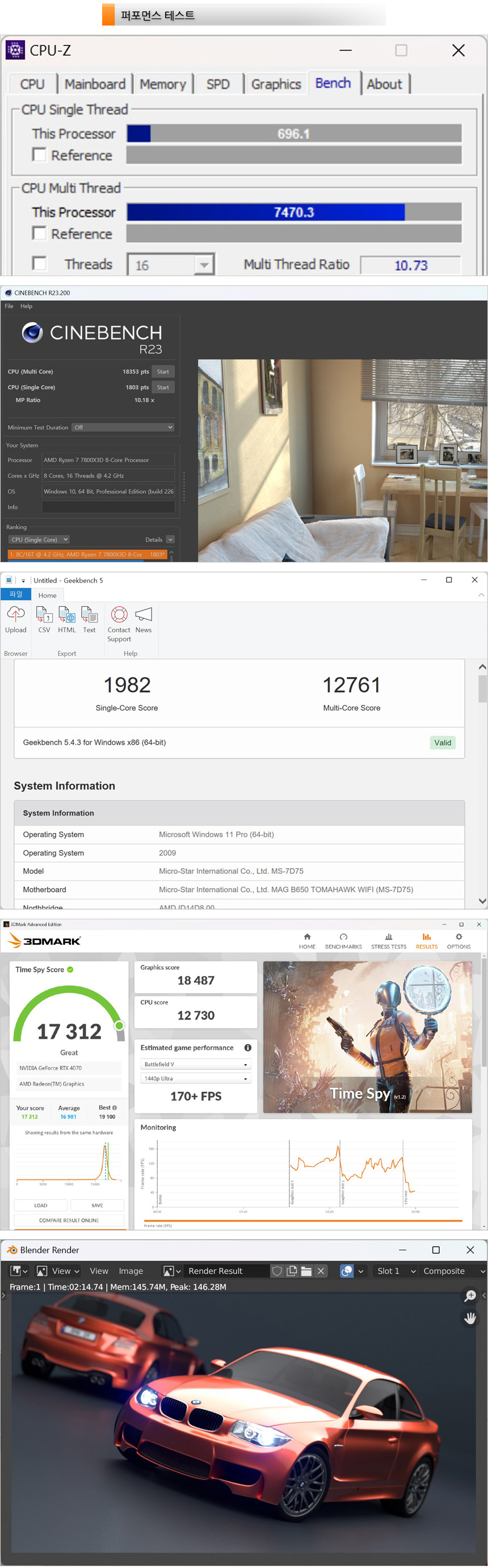 라이젠 7 7800X3D 와 RTX 4070 의 성능을 제대로 구현되는지 확인하기 위해 벤치마크 테스트를 진행한 모습으로 예상대로 높은 성능을 보여주었다. (참고로 게임 부스트나 PBO 는 적용하지 않았으며 최고의 성능 모드를 적용해 테스트 했다.) 참고로 라이젠 7 7800X3D 는 게이밍에 특화된 CPU지만 작업용으로도 충분히 활용할 수 있는 빠른 속도를 보여주었다.