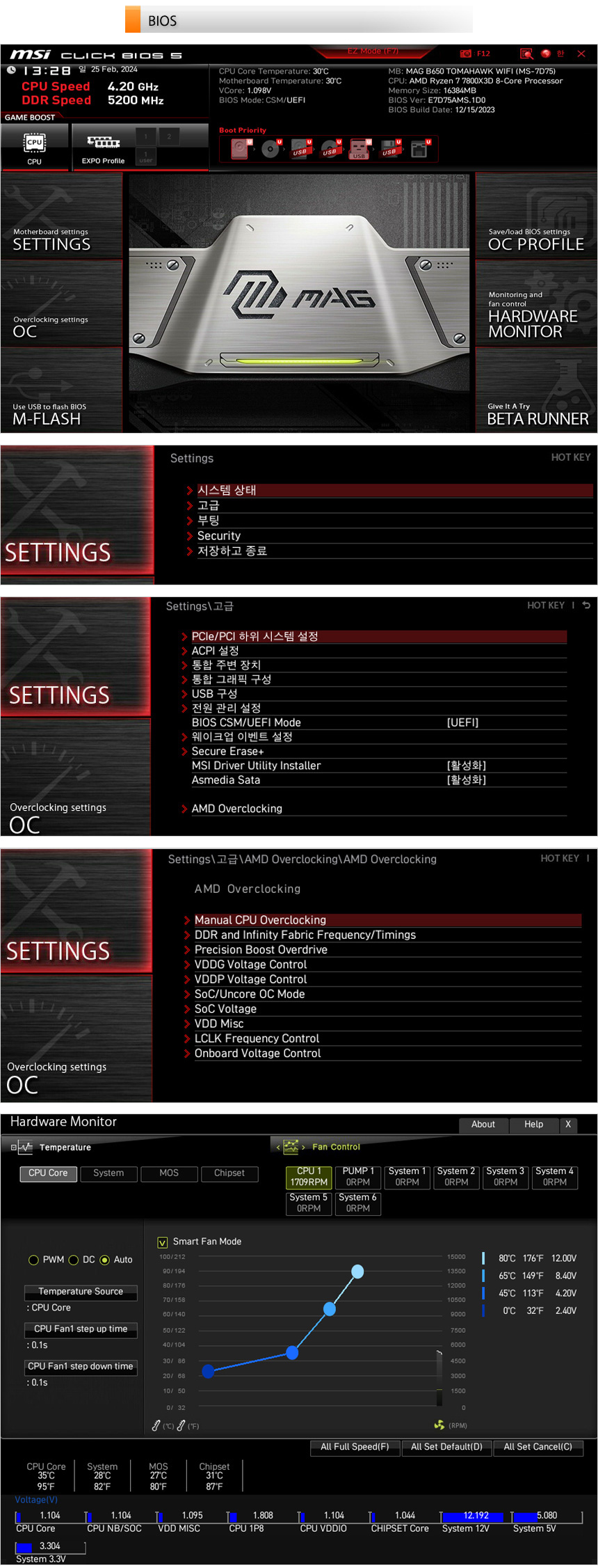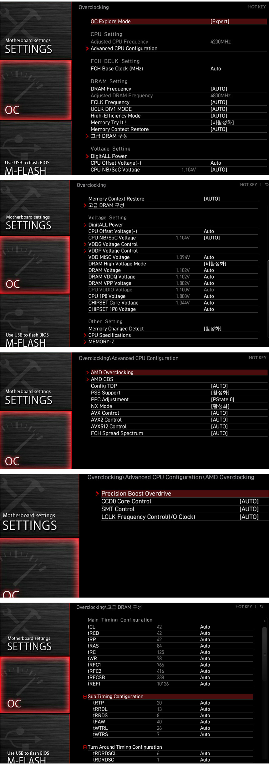 셋팅에서도 별도의 AMD 오버클러킹 메뉴를 지원하며 OC에서는 오버를 위한 다양한 메뉴가 제공된다. (PBO 가 지원되는 것을 확인할 수 있다.) @ 유튜브나 구글에서 MSI 램오버로 검색하면 램 오버 방법을 손쉽게 확인할 수 있다. AMD 시스템의 경우 램오버로 성능을 향상시킬 수 있기 때문에 방법을 숙지하고 적용하기 바란다.
