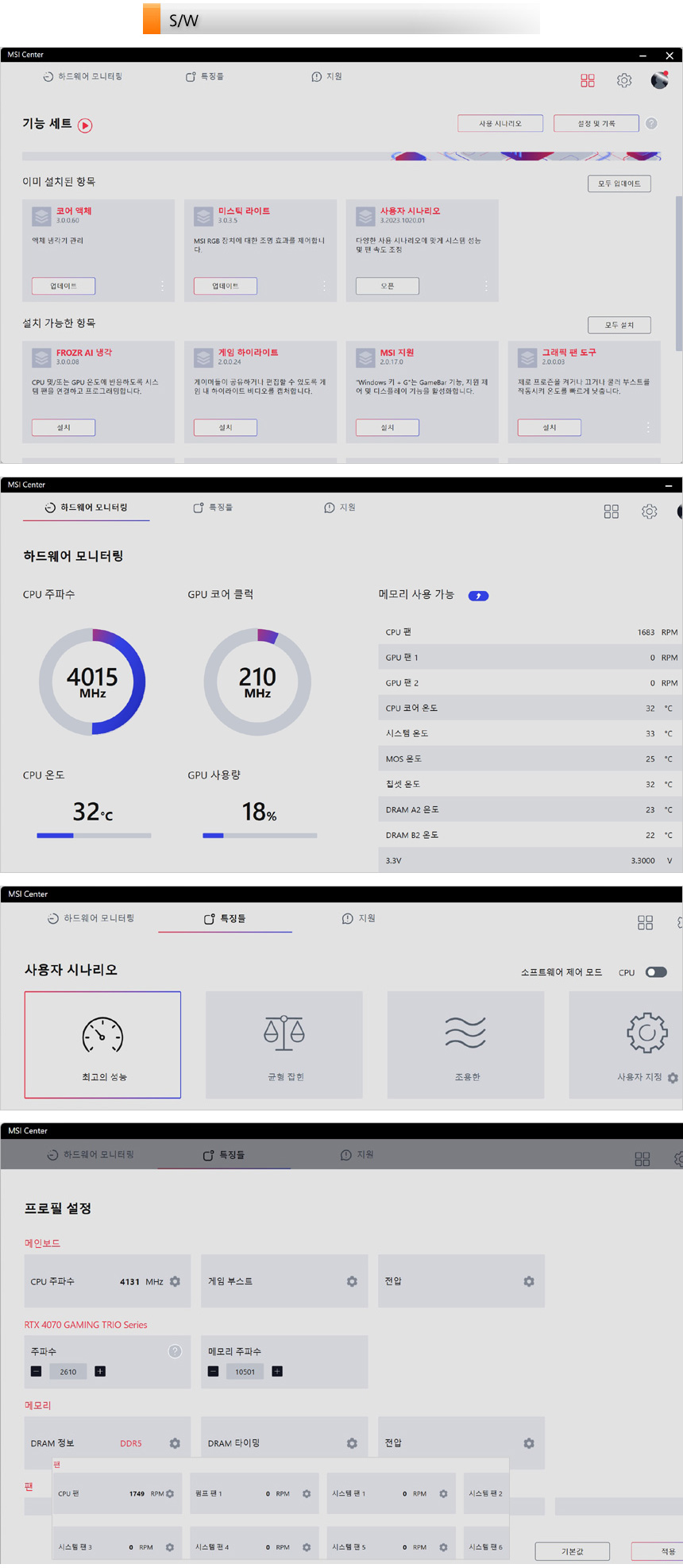 전용 S/W MSI 센터를 제공해 PC를 편하게 관리할 수 있다. 상단의 사진은 MSI 센터를 실행한 모습으로 모듈형으로 구성되어 원하는 앱을 손쉽게 설치하고 실행할 수 있으며 모니터링 기능을 지원해 사용량이나 온도 등을 손쉽게 확인할 수 있다. 또한 유저 시나리오 기능이 제공되어 퍼포먼스를 설정할 수 있으며 수동 기능을 선택하면 시스템의 전반적인 튜닝이 가능하다