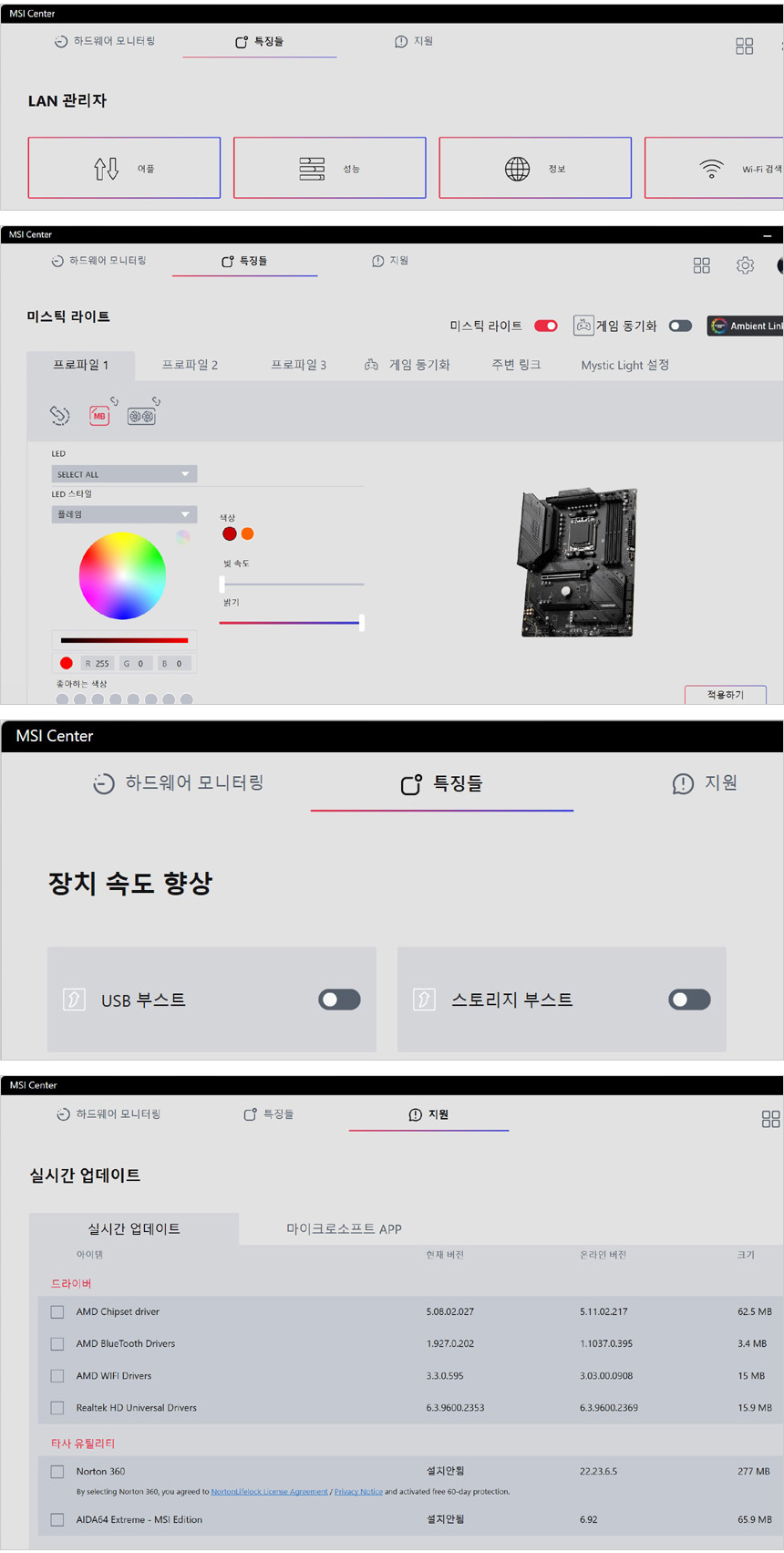 랜 관리자를 지원하며 미스틱 라이트를 통해 조명 효과를 설정 및 연동할 수 있다. 또한 USB 와 저장장치 부스트 기능을 제공하며 업데이트를 통해 최상의 컨디션으로 PC를 사용할 수 있다.