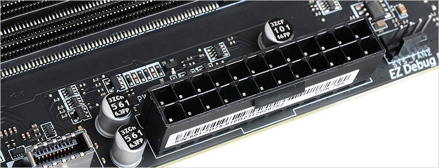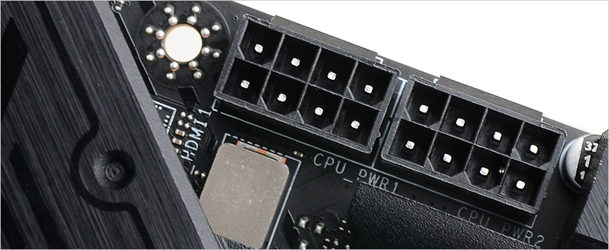 8핀 + 8핀의 CPU 전원부와 24핀 통합 전원부를 지원한다. 이 제품은 도입부에서 언급한 것과 같이 CPU 및 시스템 전체를 과전압으로부터 보호하는 회로 설계로 안정성을 높였으며 디지털 전원 설계를 통해 CPU에 정밀하고 빠른 전력을 공급한다. 또한 2개의 8핀 커넥터가 멀티코어 프로세서의 추가적인 전력을 확보해 전압강하로 인한 시스템 불안정 현상없이 깔끔하게 PC를 사용할 수 있다.