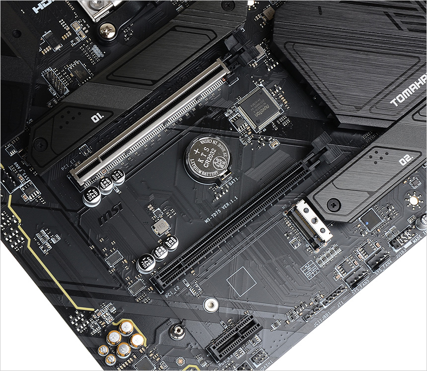 메인보드 좌측 하단에는 3개의 PCIe 슬롯이 설치되어 있다. 스틸아머가 설치된 첫 번째 슬롯은 큰 2개의 슬롯은 PCIe 4.0 x16을 지원하며 (무거운 그래픽카드 장착으로 인한 슬롯의 파손 및 휘어짐 현상을 미연에 방지한다.) 두 번째 작은 슬롯은 PCIe 4.0 x4, 세 번째 작은 슬롯은 PCIe 3.0 x1 를 지원한다.