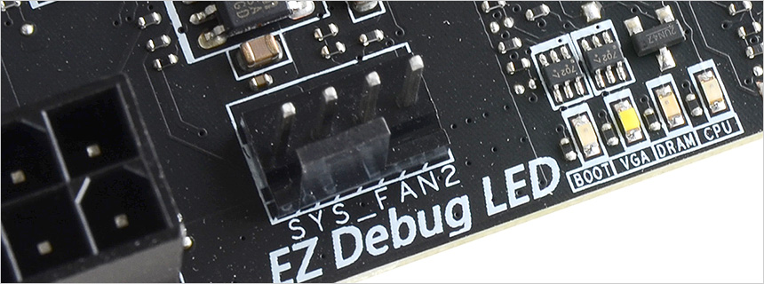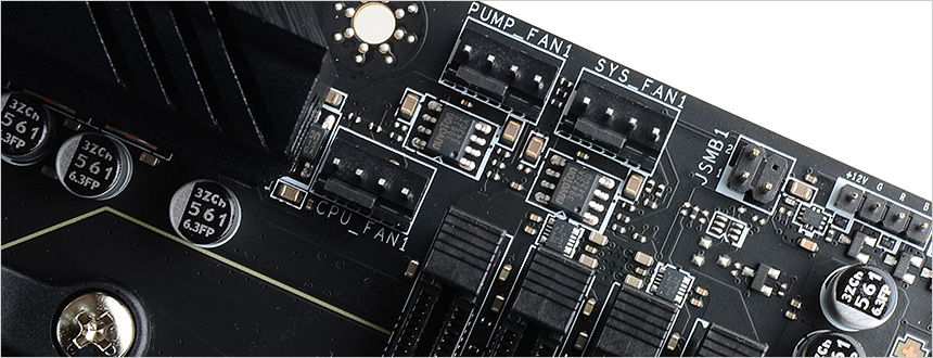 전원부 주변의 커넥터 모습으로 CPU 핀 헤더를 비롯해 수냉쿨러 워터펌프의 속도를 제어할 수 있도록 펌프 핀 헤더가 설치된 것을 확인할 수 있다. 또한 스피커 비프음으로 PC의 이상현상을 감지해야 하는 구형 PC와 달리 DEBUG LED가 부착되어 부팅시 발생되는 이상증상을 바로 파악할 수 있으며 시스템 팬 사용을 위한 2개의 커넥터와 미스틱라이트 전용단자도 제공된다.