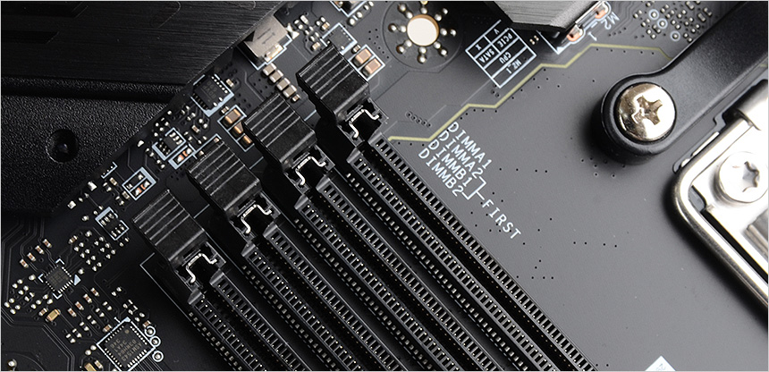 메모리 슬롯 가이드는 양쪽 모두 오픈되도록 설계되어 편하게 장착할 수 있었으며 메모리 장착 우선순위가 메인보드에 프린팅 되어 초보자도 쉽게 듀얼채널을 구성할 수 있다. 또한 장착부에는 메탈 쉴드 처리가 되어 있어 잦은 탈부착으로 인한 파손을 미연에 방지한다.