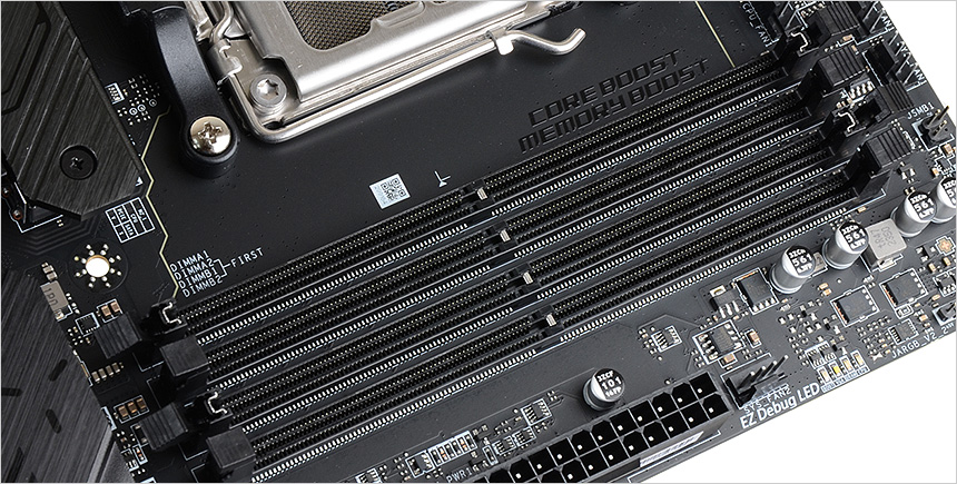 4개의 메모리 슬롯이 제공되며 최대 192GB 까지 용량을 확장할 수 있어 게이밍은 물론 대용량 메모리가 필수적인 작업용 PC용으로도 손색이 없다. 최대 7600MHz 메모리를 지원하고 EXPO 기술도 적용해 기본 메모리 뿐만 아니라 고클럭을 지원하는 튜닝램을 장착해 성능을 높일 수 있다.