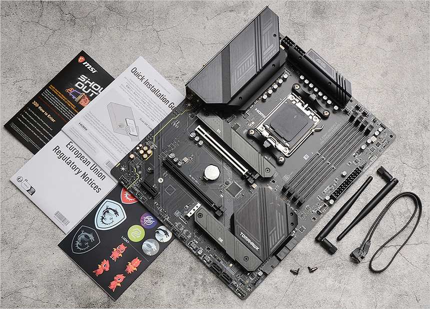 풀KIT의 모습으로 메인보드를 비롯해 퀵 매뉴얼과 스티커, 2개의 Wi-Fi 안테나, SATA 케이블이 제공되며 손쉽게 SSD를 장착할 수 있도록 2개의 EZ M.2 클립을 제공한다. (사용설명서는 PDF 파일로 제공된다.)