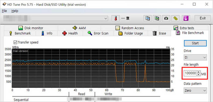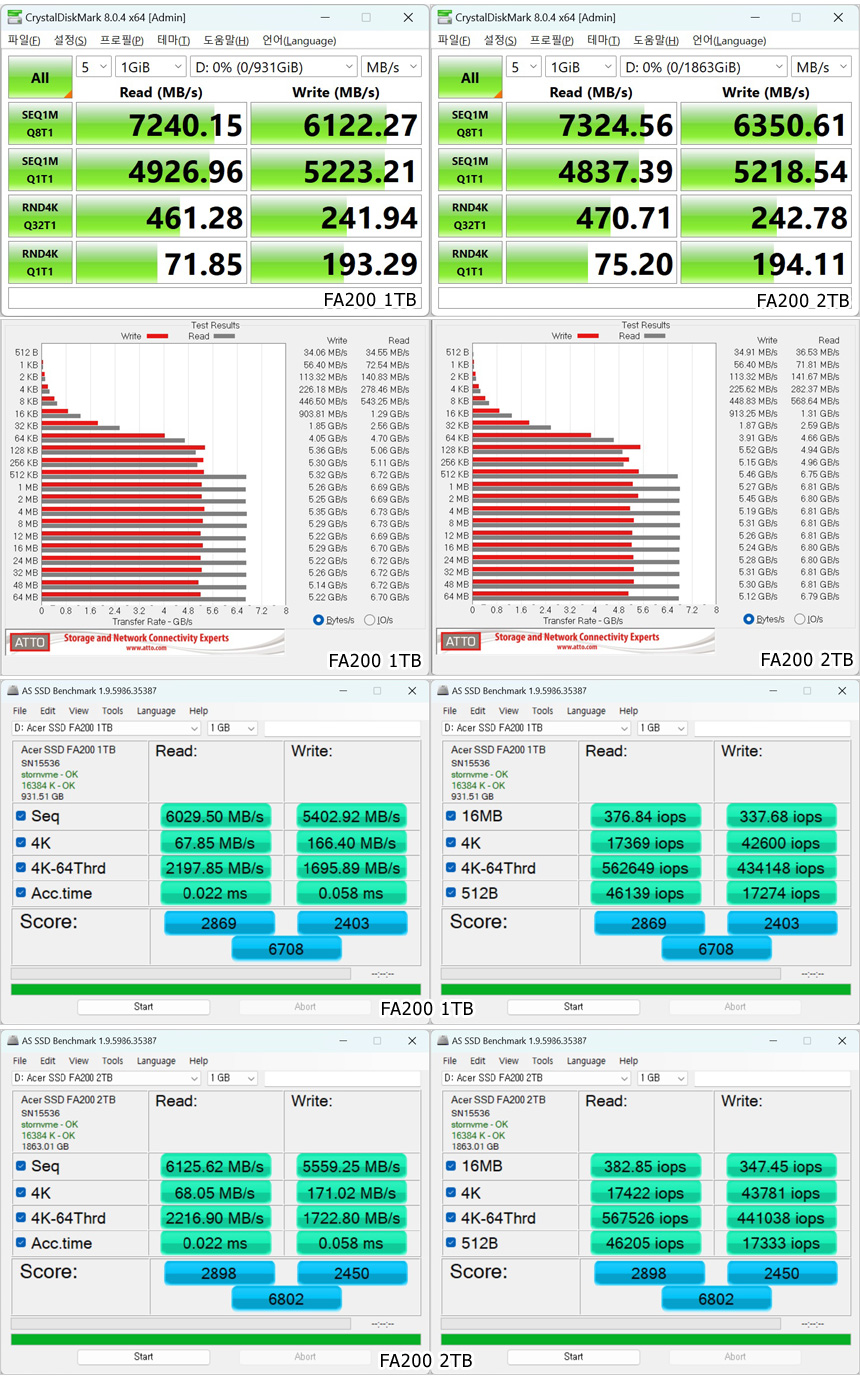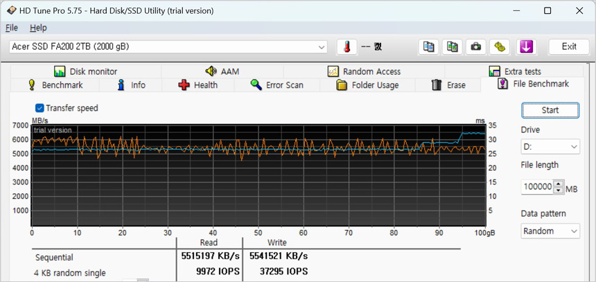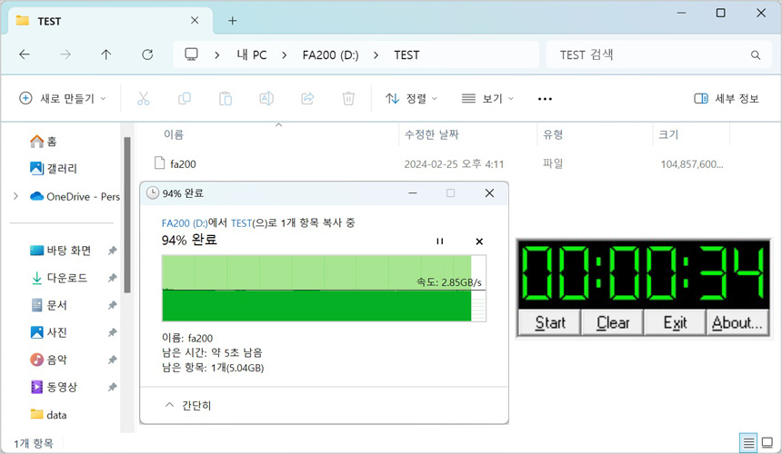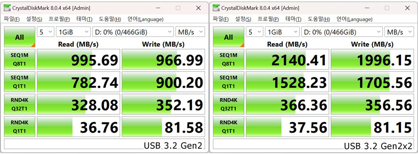 고급형 메인보드 답게 USB 3.2 Gen2x2 단자를 지원해 초고속 데이터 전송이 가능하다. 상단의 사진은 USB 3.2 Gen2x2 지원 외장 SSD를 장착해 속도 테스트를 진행하고 있는 모습으로 2,000MB/s 가 넘어가는 빠른 속도를 보여주었다. 대용량의 데이터를 다루는 유저들이라면 유용하게 활용할 수 있을 것이다. (최대 속도로 데이터를 전송하고 싶다면 반드시 USB 3.2 Gen2x2 지원 외장 SSD를 사용하기 바란다.)