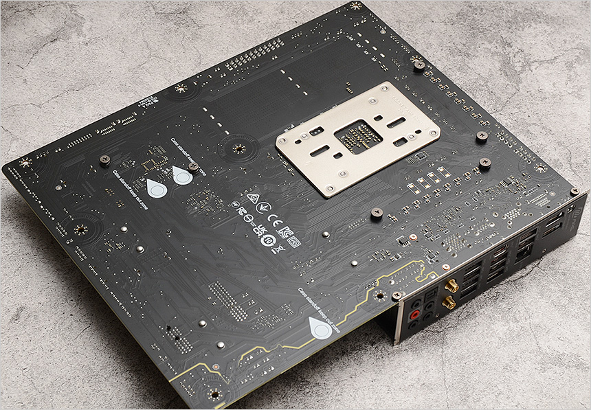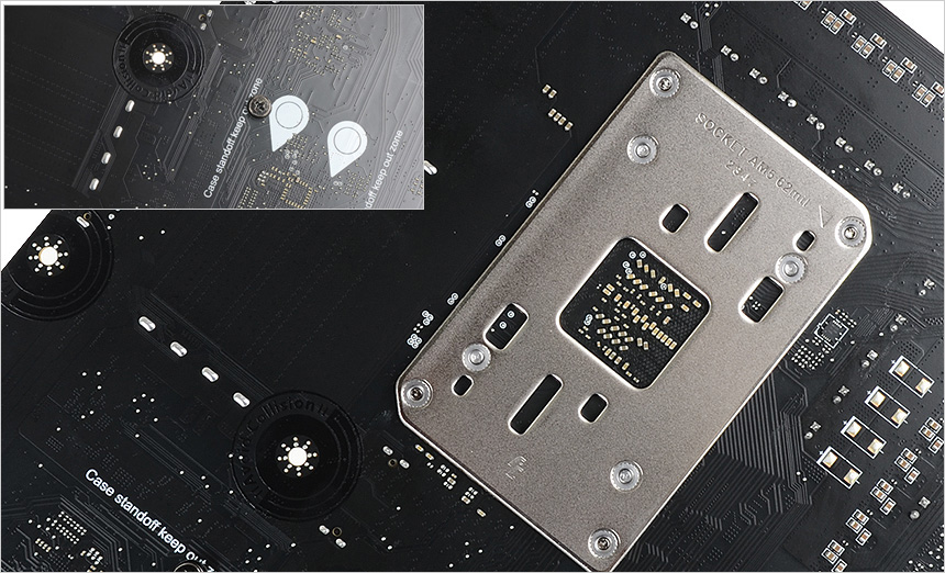 메인보드 바닥면의 모습으로 깔끔하게 디자인된 것을 확인할 수 있으며 CPU 장착부에는 쿨러 장착을 위한 메탈 보강판이 설치되어 있다. 특히 스탠드 오프나 기타 이물질과 잦은 접촉으로 인한 메인보드 고장을 미연에 방지하도록 Aviod Collision Zone을 적용했다.