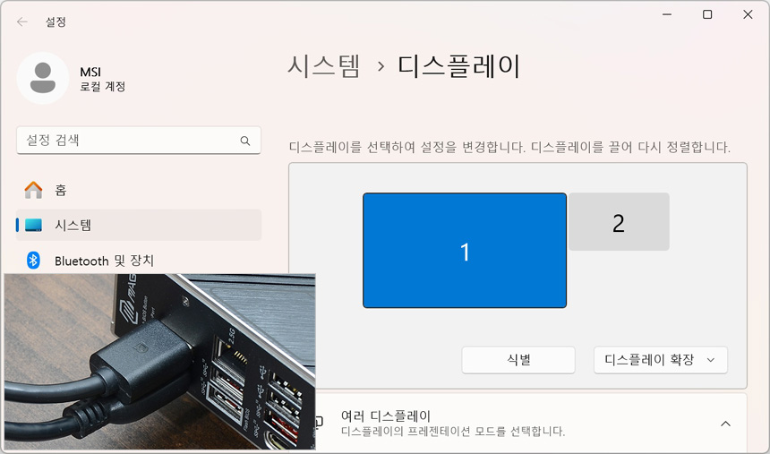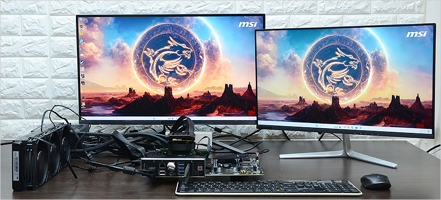 HDMI 2.1과 DP 1.4 단자를 지원해 고화질 모니터를 연결해 활용할 수 있다. 상단의 사진은 내장그래픽 상태에서 4K와 FHD 모니터를 연결한 모습으로 완벽하게 작동하는 것을 확인할 수 있었다. (고성능 시스템이 필요하지만 그래픽카드는 사용할 필요가 없는 주식용 등에서 유용하게 활용할 수 있다.)