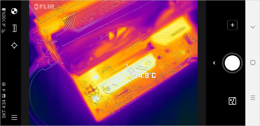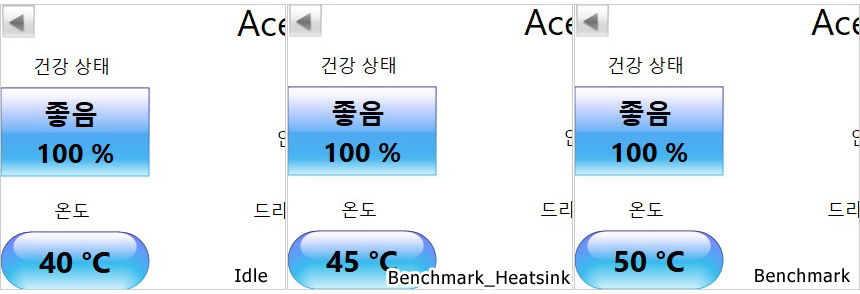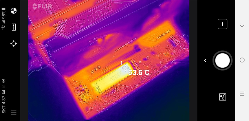 벤치마크를 실행한 상태에서 (크리스탈 디스크 마크) SSD의 표면 온도를 확인하고 있는 모습으로 M.2 쉴드 프로져를 사용했을 때 온도가 확연히 낮아진 것을 확인할 수 있다. (참고로 대부분의 NVMe 4.0 SSD는 작동중 컨트롤러 온도가 70도를 넘어가 히트싱크를 장착해 온도를 낮춰주는 것이 좋다.)