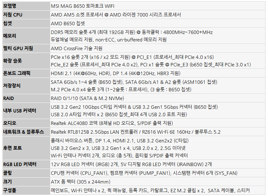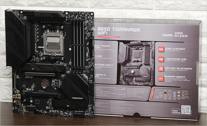이번에 리뷰를 진행 할 MSI MAG B650 토마호크 WIFI는 AMD 7800X3D 등의 고성능 프로세서를 이용해 게이밍 PC를 만들고 싶은 유저들을 위한 고급형 게이밍 메인보드로 차별화된 안정성과 다양한 고급기술을 제공한다. 17페이즈의 견고한 디틸 파워 디자인으로 최상급의 CPU도 안심하고 사용할 수 있으며 6 레이어 PCB 설계로 안정성과 신뢰성을 한층 높였다.