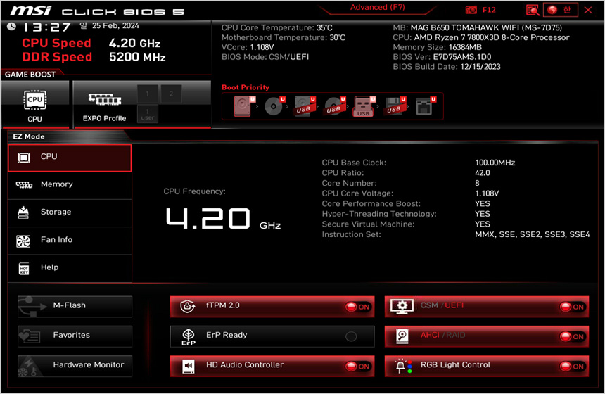 바이오스를 확인하고 있는 모습으로 손쉽게 주요 기능을 설정할 수 있는 EZ 모드와 디테일한 환경 설정이 가능한 Advanced 모드를 선택할 수 있으며 상단에 언급한 것과 같이 게임 부스트와 EXPO 설정이 가능하다. 또한 셋팅 메뉴에서 다양한 기능을 사용자에 맞게 조정할 수 있으며 하드웨어 모니터 기능도 제공한다. (고급 메뉴는 동영상을 통해 확인하기 바란다.)