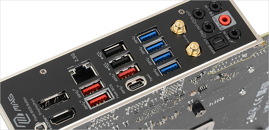 단자부의 모습으로 프리인스톨 I/O 쉴드가 적용되어 디자인 완성도를 높여줄 뿐만 아니라 입출력 단자를 안전하게 보호하고 정전기로 인한 손상을 미연에 방지한다. 4개의 USB 3.2 Gen1 단자와 3개의 USB 3.2 Gen2 단자를 지원하며 초고속 데이터 전송을 위해 20Gbps 속도의 USB 3.2 Gen2x2 단자도 적용되어 있다.