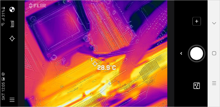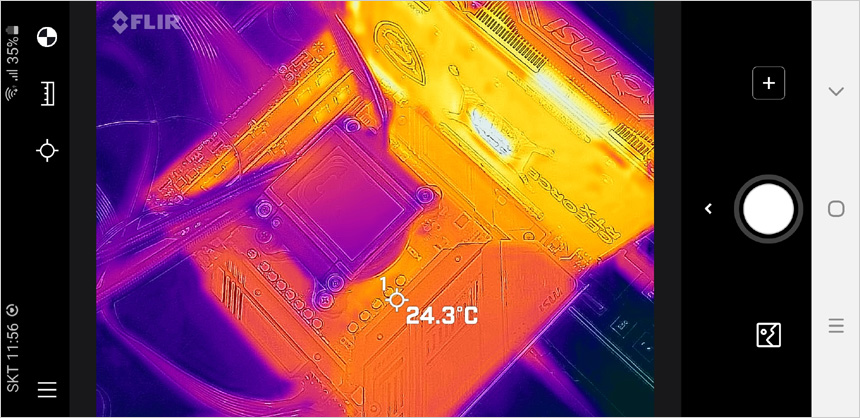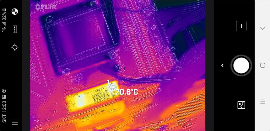 CPU와 GPU를 모두 사용하는 랜더링 작업시 전원부의 표면 온도를 열화상 카메라로 촬영한 모습으로 (실내온도 13도) 예상대로 온도가 상당히 낮은 것을 확인할 수 있다. (누드 테스트 이고 실내온도가 낮은점을 감안하기 바란다. 더운 여름에는 온도가 올라갈 수 있다.)