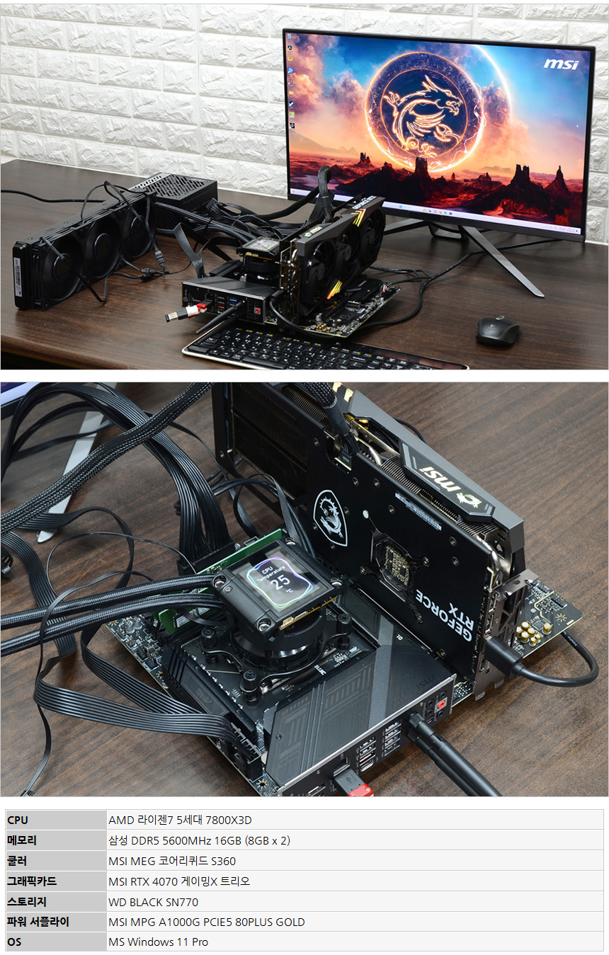 테스트용 시스템의 모습으로 게이머들의 사랑을 받고있는 라이젠7 7800X3D 프로세서를 장착했으며 2개의 DDR5 5600MHz 메모리를 듀얼채널로 구성했다. 또한 1000W 파워서플라이와 RTX 4070 그래픽카드를 사용했으며 윈도우는 11 Pro를 설치했다.