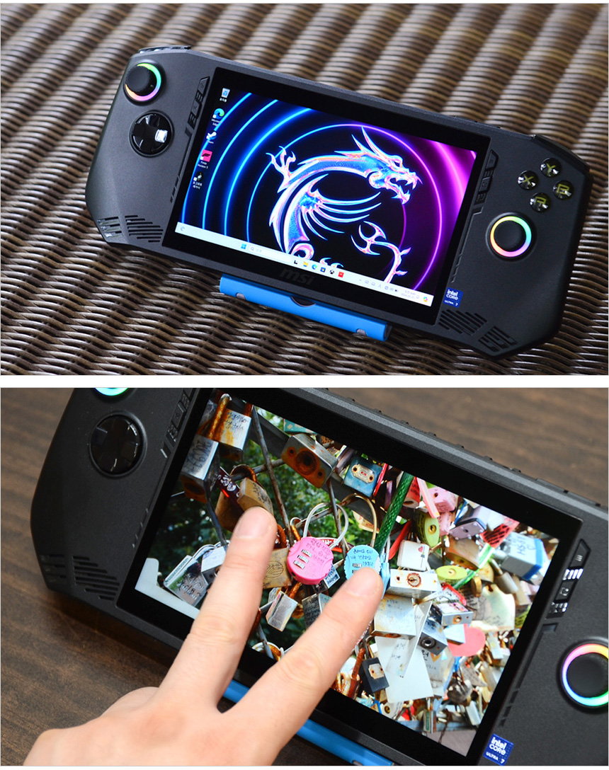 디스플레이의 모습으로 7형의 크기에 FHD (1920 x 1080) 해상도를 지원한다. (참고로 QHD 이상의 디스플레이를 탑재하면 더 높은 성능을 필요로 하며 배터리 사용시간도 짧아진다. 굳이 리스크를 안고 QHD 이상의 해상도를 지원할 필요는 없어 보인다. 패널 크기가 작기 때문에 FHD 만으로도 충분히 높은 디테일을 경험할 수 있다.) IPS 타입을 적용해 시야각으로 인한 불편없이 어떤 각도에서도 선명한 영상을 즐길 수 있으며 터치를 지원해 스틱으로 컨트롤 하기 힘든 S/W도 편하게 조작할 수 있다.
