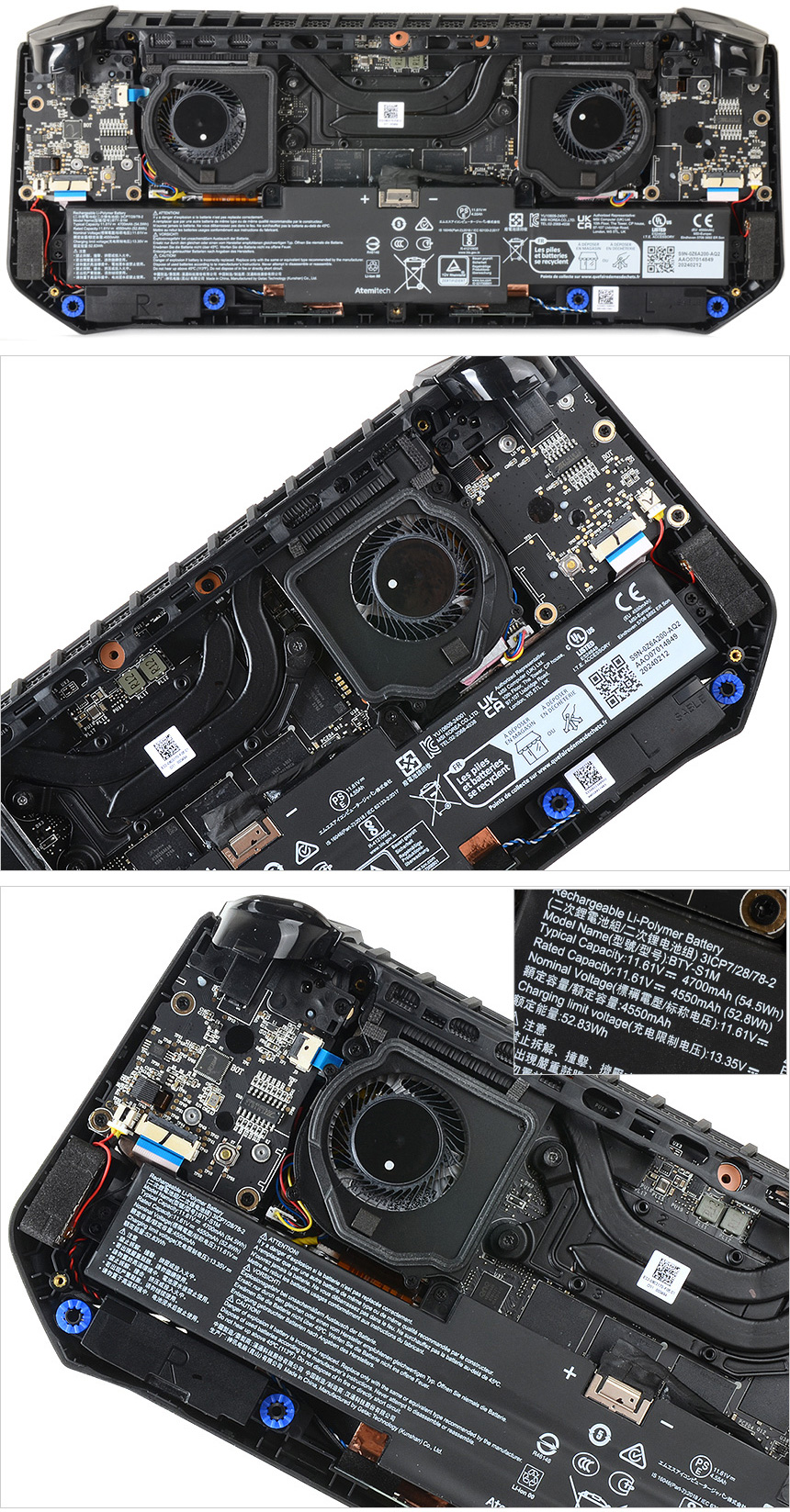 제품 내부의 모습으로 고성능 프로세서가 탑재된 모델답게 듀얼팬이 설치되어 있고 히트싱크와 히트파이프를 통해 CPU의 열을 식혀주는 것을 확인할 수 있다. 또한 16GB LPDDR5 메모리가 메인보드에 장착되어 있으며 하단에는 4700mAh 용량의 리튬이온 배터리와 무선랜 안테나, 스피커 등이 설치된 것을 확인할 수 있다.