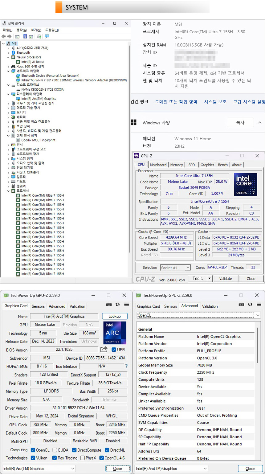 시스템 정보를 확인하고 있는 모습으로 뛰어난 성능으로 대부분의 최고급형 슬림 노트북에서 사용하고 있는 인텔코어 울트라 프로세서가 탑재된 것을 확인할 수 있다. (MSI 클로는 울트라 7과 5 탑재 모델이 각각 판매된다.) 리뷰용 모델인 MSI 클로 A1M-U7 은 6개의성능코어와 8개의 효율코어에 2개의 초저전력 코어가 추가되어 있으며 인텔 NPU도 적용되어 CPU 사용율과 전력소모를 최소화 하는 동시에 윈도우 기반의 AI 처리속도를 한층 향상 시켰다.