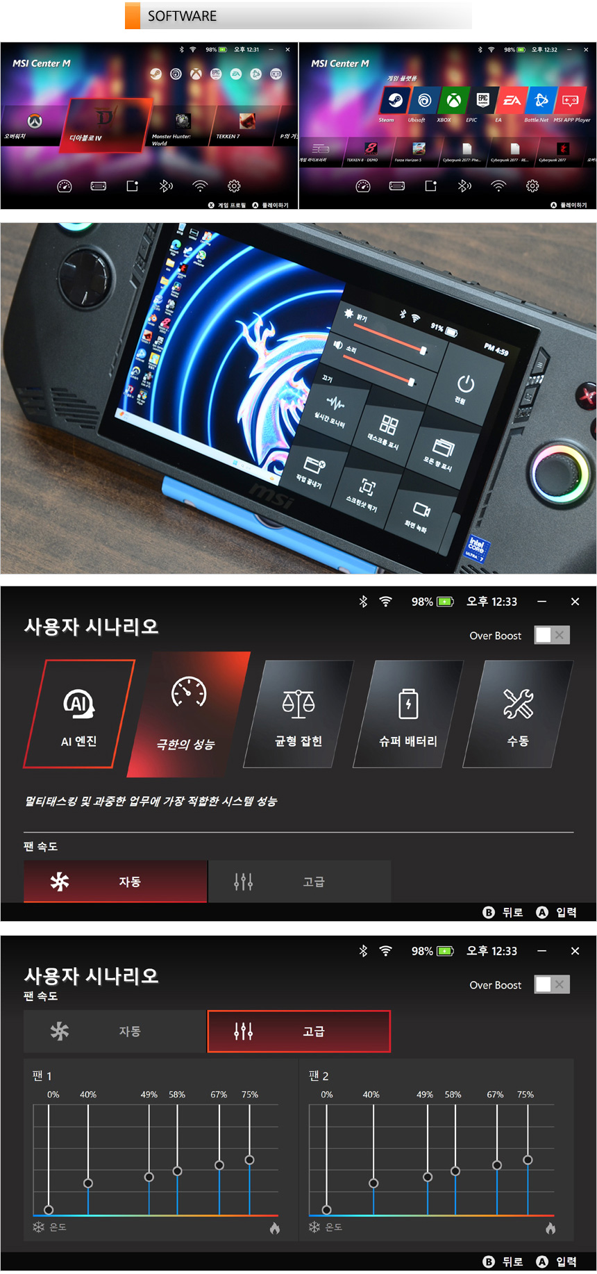 버튼과 터치로만 설정이 쉽게 않는 단점을 커버하기 위해 핸드헬스에 특화된 MSI 센터 M을 제공한다. 손쉽게 선할 수 있도록 아이콘이나 인터페이스가 구성되어 있으며 전용 버튼을 지원해 손쉽게 실행할 수 있다. 특히 빠른 설정을 지원해 주요 기능을 편하게 조정할 수 있으며 사용자 시나리오 지원으로 퍼포먼스를 원하는 대로 조정할 수 있다.
