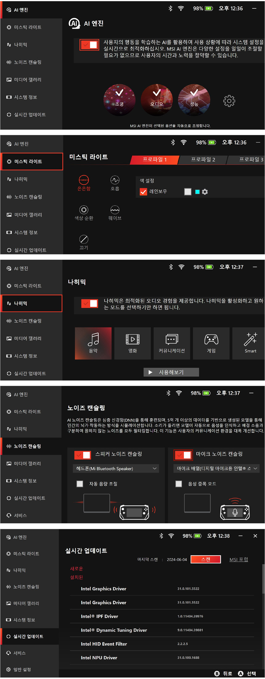 설정 화면의 모습으로 자동으로 기기를 셋팅할 수 있는 AI 엔진을 제공하며 미스틱 라이트의 조명 효과도 손쉽게 변경할 수 있다. 또한 미스틱 라이트 지원으로 스피커와 마이크의 노이즈 캔슬링 지원으로 깔끔한 사운드를 즐길 수 있다. 또한 업데이트 지원으로 최상의 컨디션을 유지할 수 있다. @ 바이오스 업데이트를 통해 성능을 향상시켰다. 제품을 구입했다면 꼭 업데이트를 실행하기 바란다.