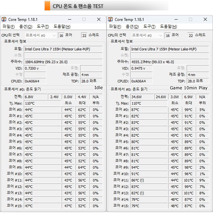 CPU 온도 테스트를 진행하고 있는 모습으로 (최고성능 모드, 실내온도 27도) 아무것도 하지 않는 Idle 상태에서는 40도 중반으로 작동했으며 10분간 게임을 실행했을 때 80도 중반까지 온도가 올라가는 것을 확인할 수 있었다. (대부분의 상황에서 80도 대에서 작동했다.)