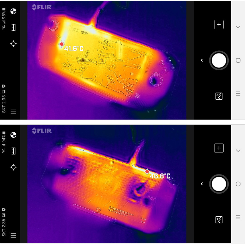 열화상 카메라를 이용해 게임 실행시 노트북의 열분포를 확인하고 있는 모습으로 예상보다 온도가 높지 않은 것을 확인할 수 있었다. (통풍구의 온도가 가장 높다. 게임 실행시 절대 통풍구를 가리지 말기 바란다.) 특히 손으로 쥐는 그립부의 온도가 상당히 낮아 게임 실행 내내 열로 인한 스트레스는 없었다.