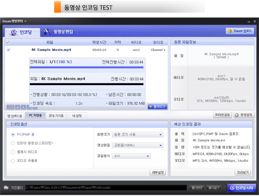 다음 팟인코더를 이용해 4K 동영상의 인코딩을 진행하고 있는 모습으로 3분 44초의 빠른 인코딩 시간을 보여주었다.