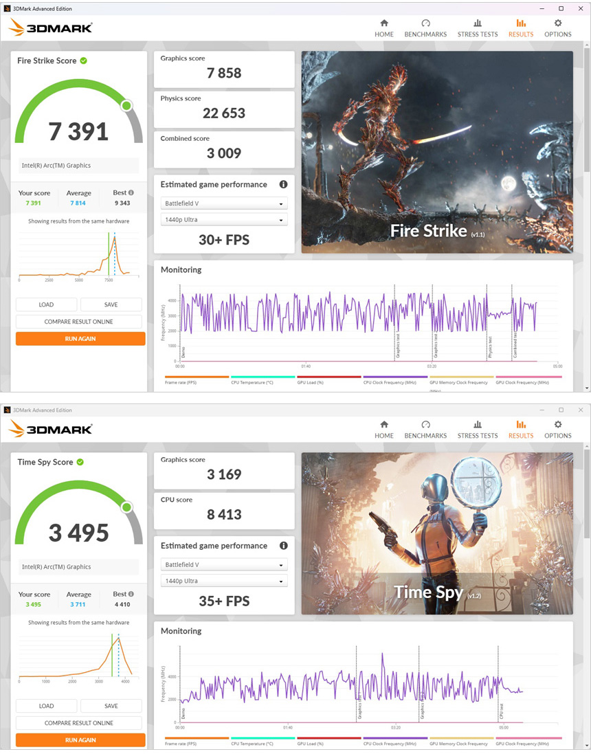 3DMARK를 이용해 3D 성능을 확인하고 있는 모습으로 인텔 아크 그래픽이 내장된 모델답게 캐주얼한 3D 게임 뿐만 아니라 최신 게임도 옵션 조정을 통해 즐길 수 있을 정도로 높은 스코어를 보여주었다.