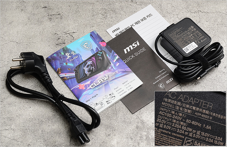 기본 제공되는 액세서리의 모습으로 C타입의 65W 전원 어댑터와 전원 케이블, 퀵 매뉴얼, 보증서를 제공한다. (전원 어댑터는 다양한 전압을 지원해 스마트폰 충전용으로도 활용할 수 있다.)