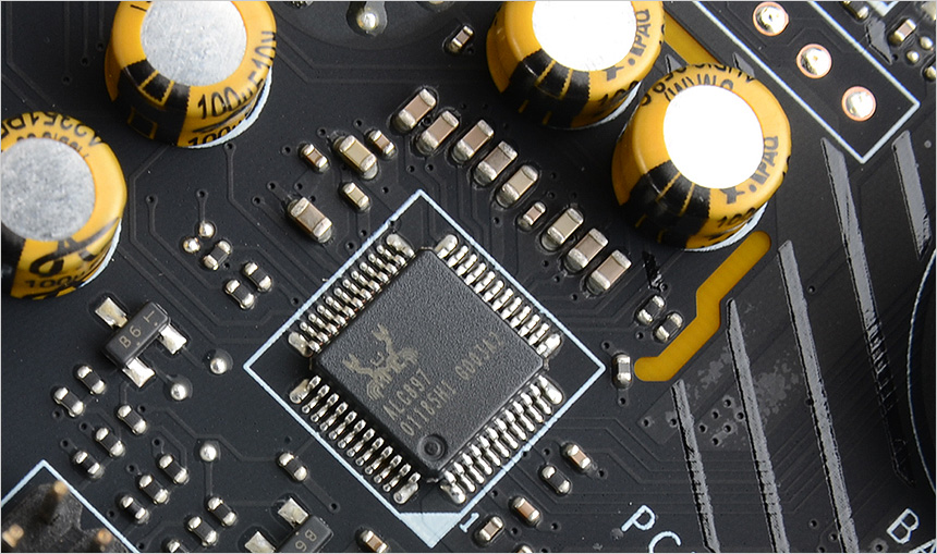 8채널 오디오를 지원하는 Realtek ALC897 코덱이 설치되어 입체감 있는 사운드를 구현할 수 있으며 고품질 오디오 캐패시터가 장착되어 퀄리티 높은 사운드를 제공한다.