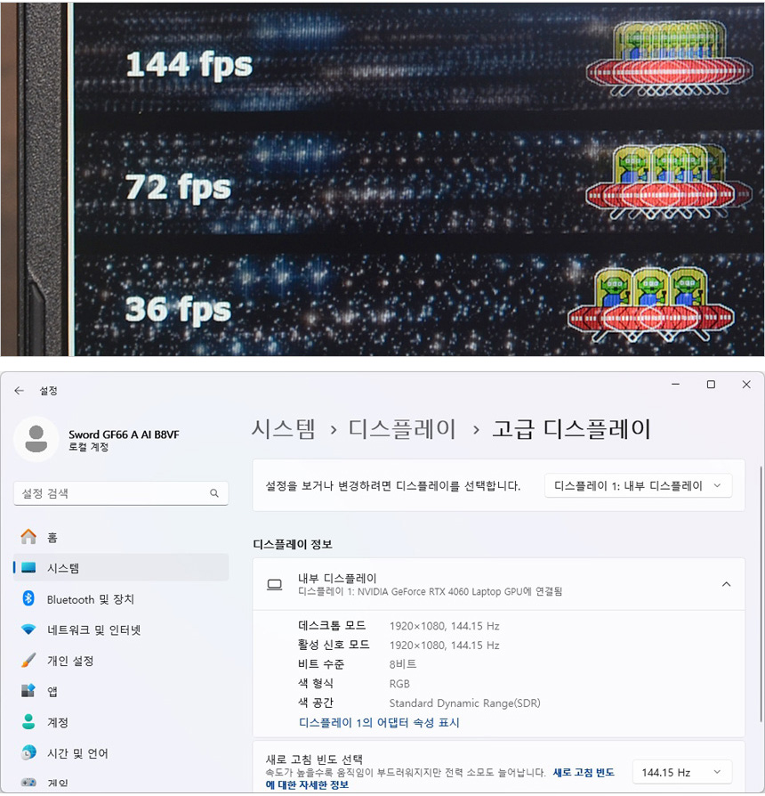 60Hz 주사율을 지원하는 일반 노트북과 달리 144Hz 주사율 지원으로 더 부드러운 영상을 즐길 수 있다. 상단의 사진은 하위 프레임과 같이 재생되는 영상 (960 Pixel Per Sec) 을 셔터스피드 1/20 로 촬영한 모습으로 프레임이 낮을수록 캐릭터의 수가 적으며 프레임이 높아질수록 시간당 많은 화면이 뿌려지기 때문에 캐릭터의 수가 많은 것을 확인할 수 있다. (실제 눈으로 보았을 때 에는 144Hz 가 훨씬 부드러워 보인다.)