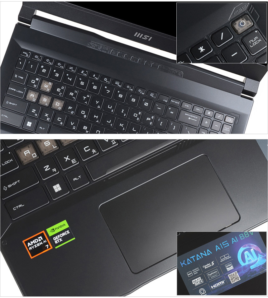키보드 1열에는 전원 버튼을 비롯해 밝기와 볼륨, 키보드 백라이트 밝기 등을 조절할 수 있는 펑션키가 제공되어 편하게 노트북을 조작할 수 있다. 또한 팜래스트 중앙에는 터치패드가 설치되어 마우스를 사용하기 힘든 환경에서도 편하게 노트북을 조작할 수 있다. @ 이 제품은 글로벌 모델명은 KATANA 이며 국내에서는 소드 시리즈로 유통된다. 이점 참조 바란다.