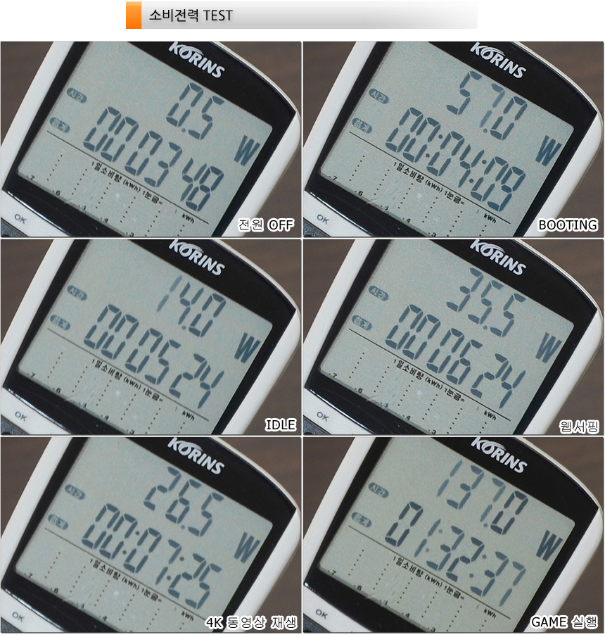 소비전력 테스트를 진행하고 있는 모습으로 (최고성능 모드) 캐주얼한 작업시에는 30W 내외의 소비전력을 보여 주었으며 게임 실행시에는 140W 까지 소비전력이 올라갔다. @ 게임에 따라 100W에서 140W 까지 소비전력이 변경되었다.