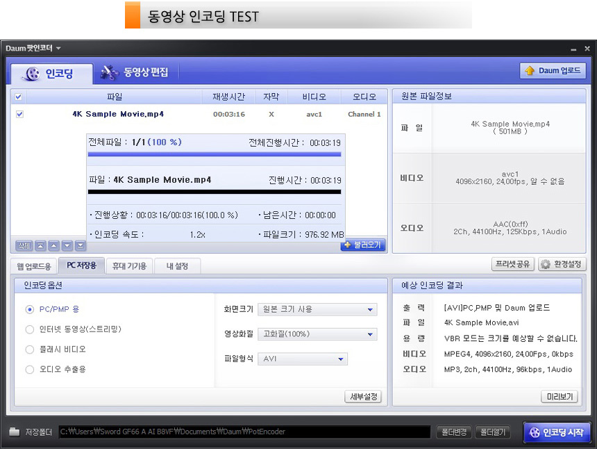 동영상 인코딩 테스트를 진행하고 있는 모습으로 3분 19초의 빠른 인코딩 속도를 보여주었다.