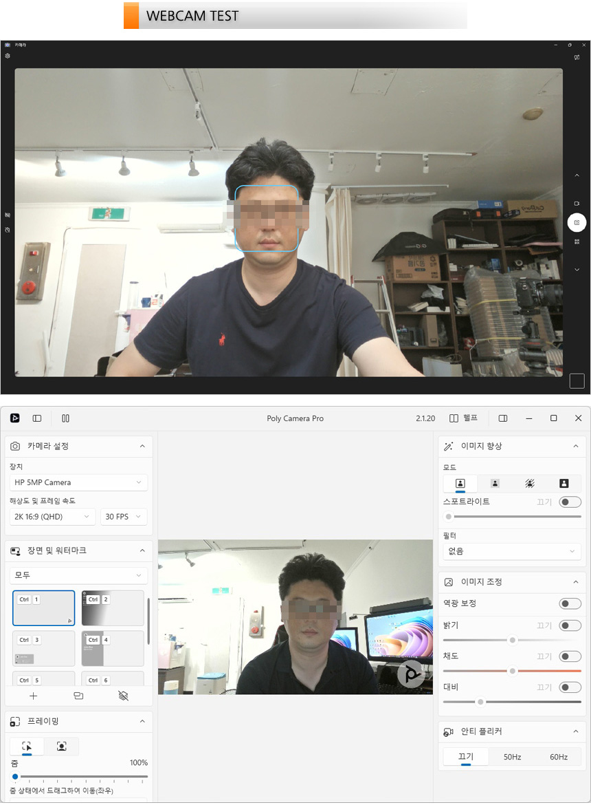웹캠의 화질을 확인하고 있는 모습으로 5MP 고해상도를 지원하는 모델답게 디테일이 아주 뛰어난 것을 확인할 수 있었다. 셀프촬영이나 화상회의 등의 용도로 유용하게 사용할 수 있을 것이다. 특히 폴리 스튜디오를 지원하는 제품으로 다양한 카메라 관련 설정이 가능하다. 화상회의에서 유용하게 활용할 수 있을 것이다.