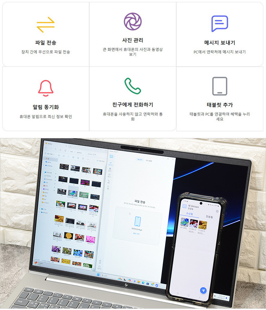 모바일 파일전송 S/W 인 HP QuickDrop이 인텔 유니슨으로 대체되었다. (HP QuickDrop은 서비스가 종료되어 사용할 수 없다.) 상단의 사진은 스마트폰과 노트북에 인텔 유니슨 앱을 설치하고 파일전송 테스트를 진행하고 있는 모습으로 드래그앤 드롭 만으로 사진을 손쉽게 전송할 있었다. (동영상을 자세히 확인하기 바란다.)