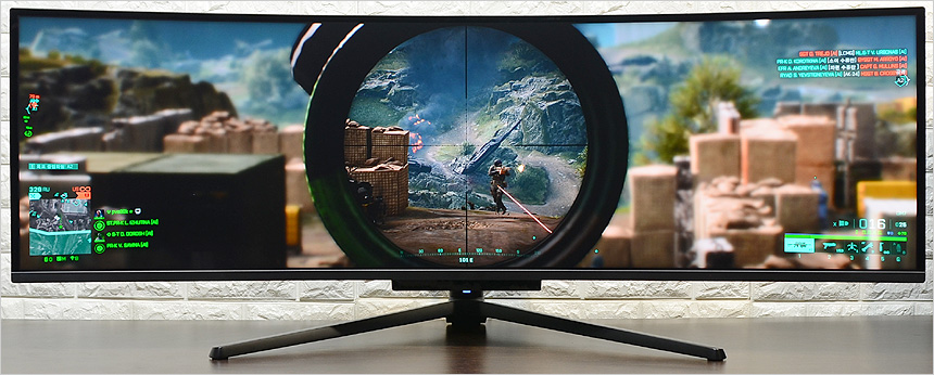 게임 테스트를 진행하고 있는 모습으로 60Hz 주사율을 지원해 게이밍 모니터와 움직임에도 분명한 차이가 느껴졌다. 하지만 게이밍 모니터와 확연히 비교되는 뛰어난 화질과 높은 밝기로 높은 몰입감을 경험할 수 있었다. 또한 조준선을 기본 지원해 사격 정확성을 높일 수 있었으며 프리싱크와 지싱크 어댑티브를 지원해 화면의 이상현상 없이 원할하게 게임을 즐길 수 있다. 기본적으로 높은 밝기를 지원할 뿐만 아니라 FPS 등의 화면모드를 제공해 야간맵이나 어두운 실내맵에서도 시인성이 떨어지지 않았다. (디아블로나 P의 거짓과 같이 어두운 배경을 주를 이루는 게임을 즐길 경우 특히 만족할 것이다.)