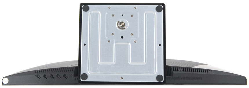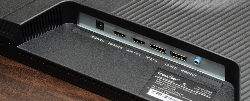 중앙에는 75mm 베사홀이 설치되어 벽에 걸거나 ARM 등에 장착해 사용할 수 있으며 (툴리스 방식의 받침대를 지원해 손쉽게 탈착할 수 있다.) 하단 중앙에는 두 개의 DP 1.2 단자와 HDMI 2.0 단자를 지원해 PC는 물론 게임콘솔이나 IPTV, OTT 플레이어 등을 손쉽게 연결할 수 있다.