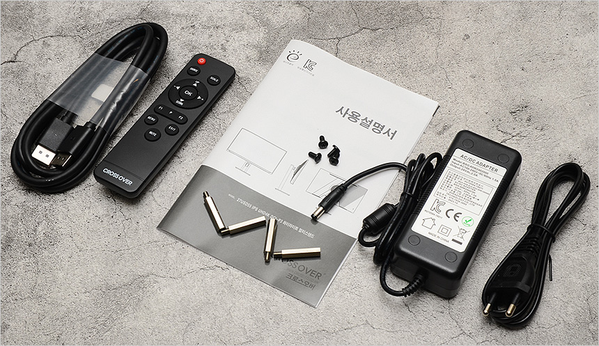 기본 제공되는 액세서리의 모습으로 전원 어댑터와 케이블, DP케이블이을 비롯해 리모콘과 설명서, 베사 연장볼트 등이 포함된 것을 확인할 수 있다.