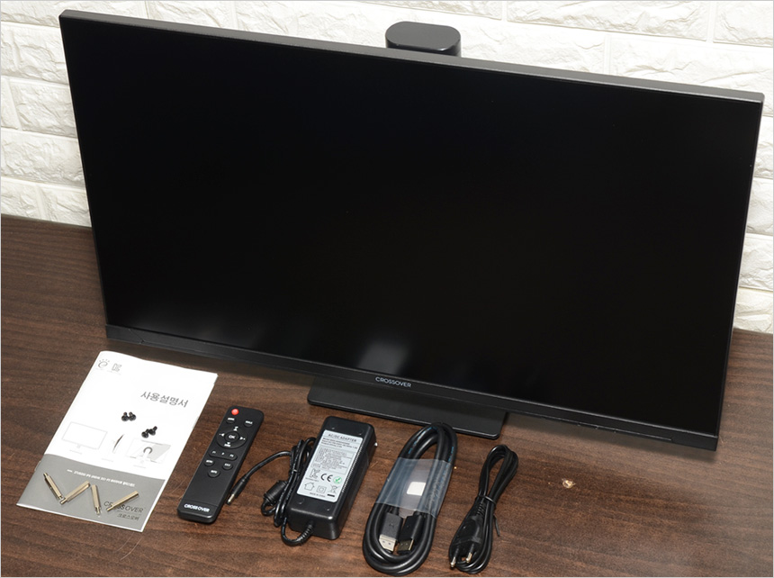 풀KIT 의 모습으로 모니터를 비롯해 전원 어댑터와 케이블이 제공되며 PC 연결을 위한 DP 케이블과 무선리모콘, 설명서, 볼트, 드라이버 등이 포함되어 있다.