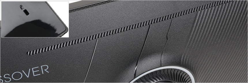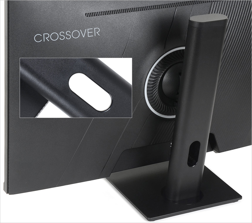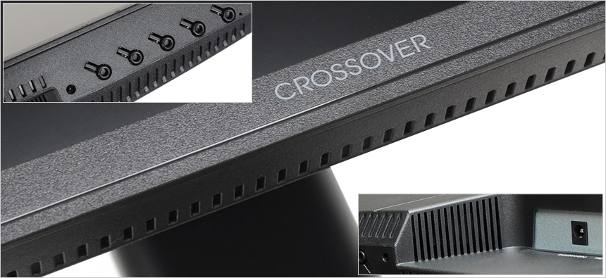 전면 하단부의 모습으로 중앙에 크로스오버 로고가 세겨져 있으며 OSD 버튼이 설치되어 모니터를 손쉽게 셋팅할 수 있다. 또한 상태표시 LED를 지원하며 양 측면에 스피커가 장착되어 시원시원한 사운드를 즐길 수 있다.
