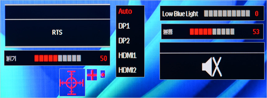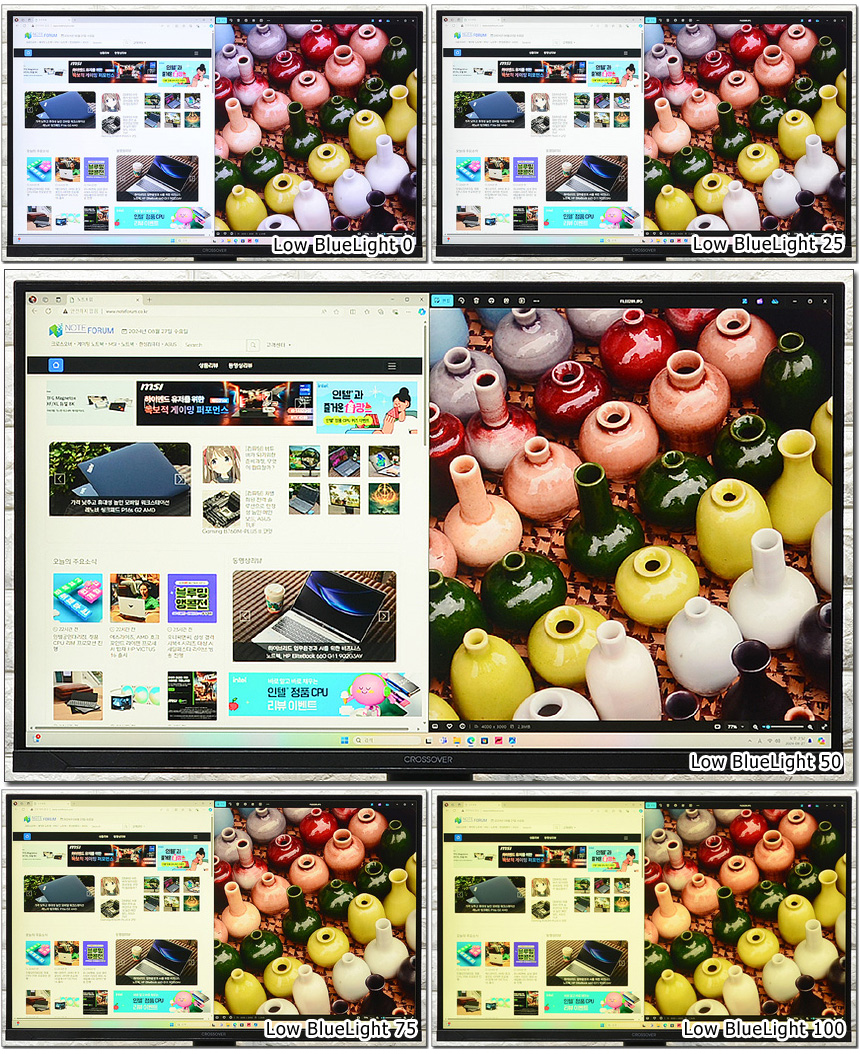 청색광으로부터 눈을 보호할 수 있는 블루라이트 감소 기능을 제공한다. 상단의 사진은 테스트를 진행하고 있는 모습으로 설정에 따라 블루라이트가 현저히 줄어드는 것을 확인할 수 있다. (단, 색이 왜곡되기 때문에 게임이나 동영상 감상 보다는 흰색 배경에서 작업이 이루어지는 웹서핑이나 오피스 프로그램 등에서 사용하는 것을 권한다.)