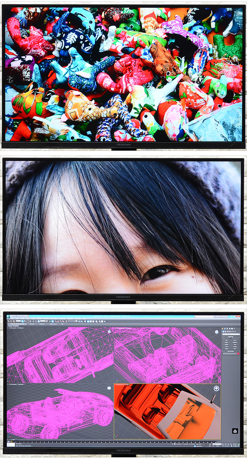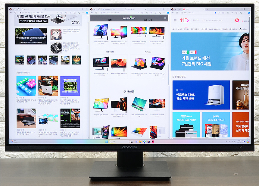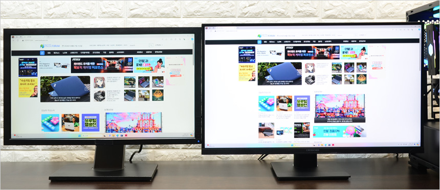 리뷰를 진행한 크로스오버 27USD55 UHD 4K DCI-P3 하이라이트 멀티스탠드 전문가용이 아닌 50만원 미만의 메인스트림급 에서 는 화질에 특화된 제품을 선택하려는 유저들에게 좋은 대안이 될 것이다. 10억 7천만 컬러의 프리미엄 IPS 패널을 사용해 선명한 영상을 보여주며 (테스트를 위해 모니터를 켠 순간 바로 알 수 있을 정도로 진하게 색을 표현했다.) 400cd/㎡ 의 높은 밝기를 지원해 어둡고 칙칙한 영상을 보여주는 일부 모니터들과 확연히 다른 화사한 영상을 선사했다.