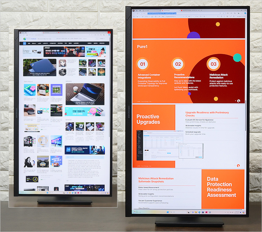 모니터 깜빡임으로 인한 눈의 피로를 최소화 하기 위해 플리커 프리 기술을 지원한다. 상단의 사진은 테스트를 위해 일반 모니터를 추가로 셋팅한 모습으로 눈으로 볼 때에는 큰 차이가 없는 것을 확인할 수 있다.