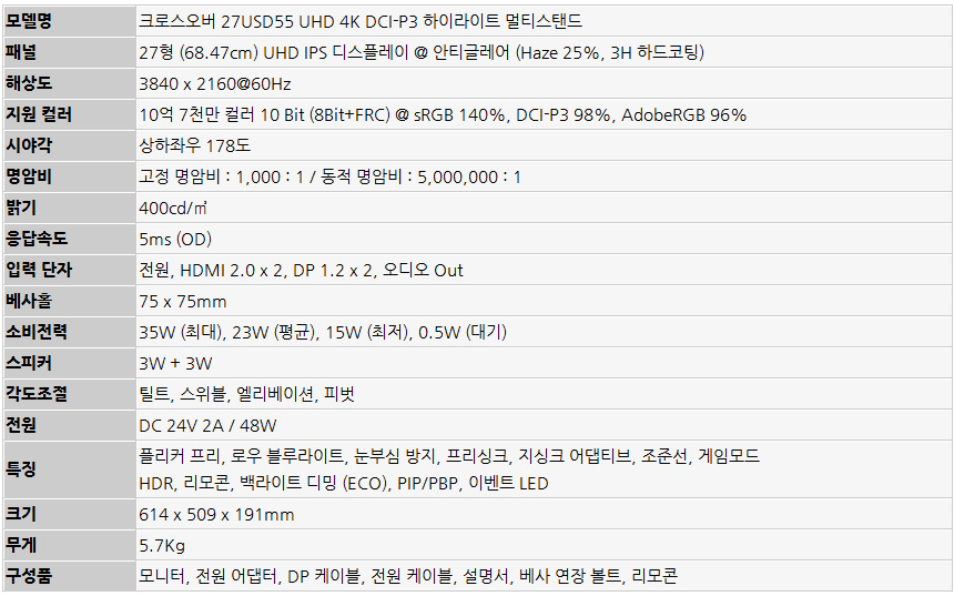 이번에 리뷰를 진행 할 크로스오버 27USD55 UHD 4K DCI-P3 하이라이트 멀티스탠드는 화질에 특화된 4K 모니터로 10억 7천만 컬러의 프리미엄 IPS 패널 탑재해 한차원 높은 디테일과 색감을 즐길 수 있으며 DCI-P3 98%, sRGB 140%, Adobe RGB 96% 의 높은 색 정확도를 지원해 사진작가나 디지털 디자이너 등 전문직 종사자 들이 유용하게 사용할 수 있다.