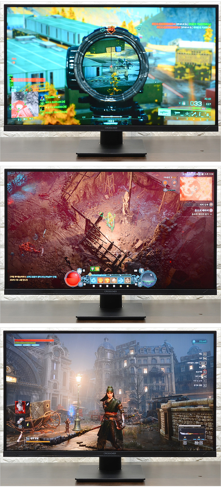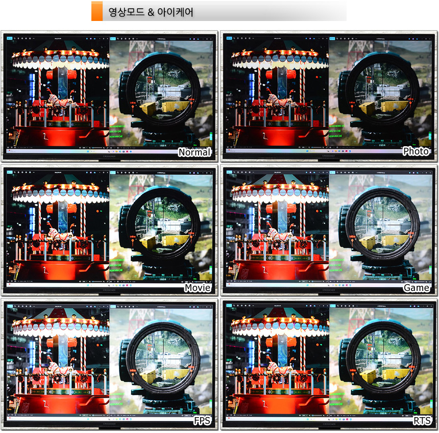 게이밍 명가 크로스오버 모델답게 다양한 게임관련 기술을 지원하는 것도 마음에 드는 부분이다. 조준선, 프리싱크, 응답속도 설정이 가능해 대부분의 게임을 쾌적한 환경에서 즐길 수 있으며 FPS 등의 게임화면 모드를 지원해 어두운 곳에서도 명확하게 캐릭터를 구분하게 빠르게 대응할 수 있었다.